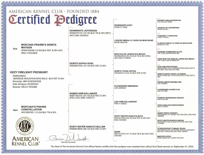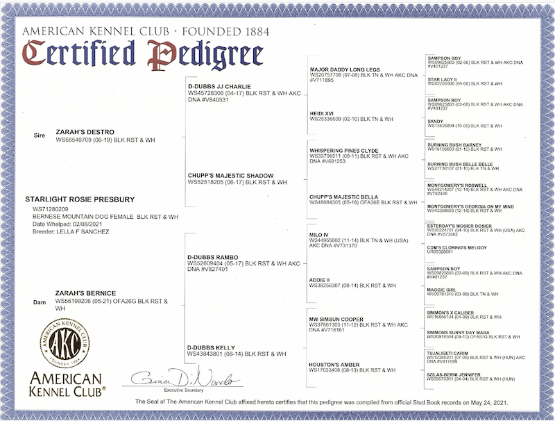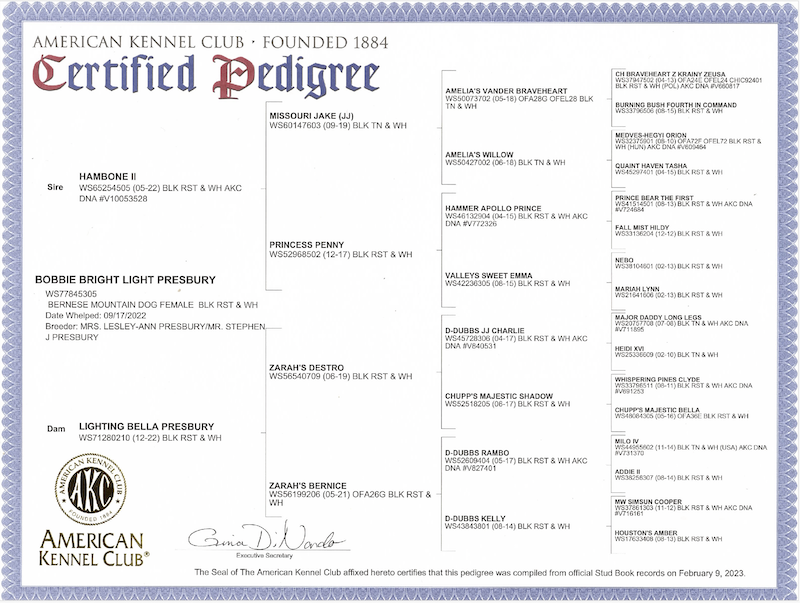 All three of our Dams and Sire are Full Pedigree pure breed Bernese Mountain Dogs with full registration with the American Kennel Club