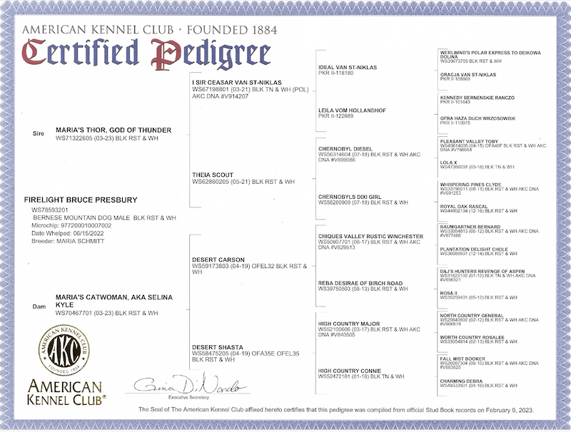 Both Dams and Sire are Full Pedigree pure breed Bernese Mountain Dogs fully registered with the American Kennel Club